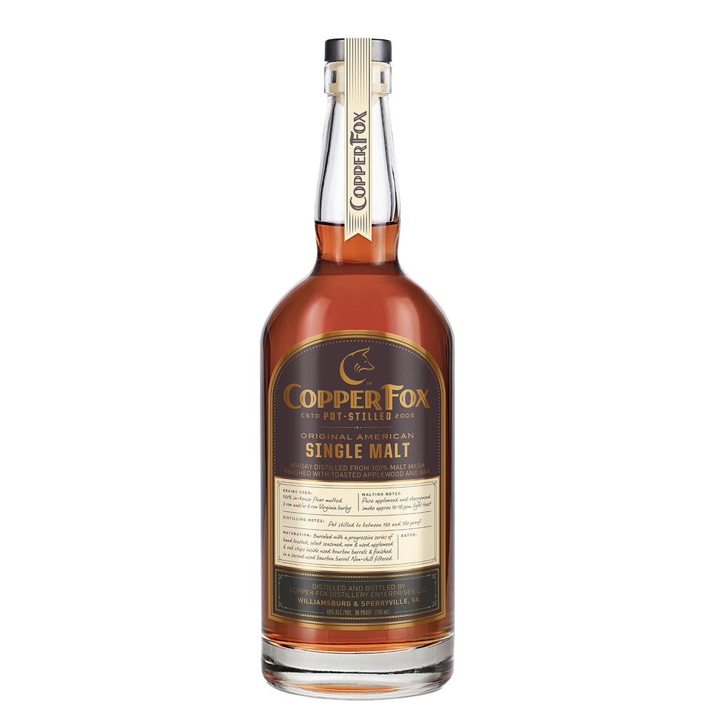 The first US distillery to have a malt floor and kiln since the repeal of Prohibition, all grains for Copper Fox whisky are grown locally by one farmer. The barley is floor malted in a traditional manner. Instead of peat, local fruit woods are used in the kiln to gently smoke the grain. The only distillery in the world to age their whisky using toasted apple wood, which results in a complex and unique flavor experience, all Copper Fox whiskies are non-chill filtered and double pot-distilled at a low proof of 150-160 to further bring out the fruitiness.Copper Fox American Single Malt Whisky is their signature offering, made from 100% hand malted Virginia barley. Dried with hand-cut apple wood and cherry wood smoke, it’s aged in ex-bourbon barrels for up to 18 months and finished with toasted apple wood and oak chips. Bottled at 96 proof, the nose greets with rich aromas of suede, olive tapenade and honey while the palate is full of flavors of dried mango chutney, clay and fruity notes. This is a smoky, complex and balanced whisky, perfect for sipping on its own or for elevating any cocktail. Get your craft American Single Malt today!
