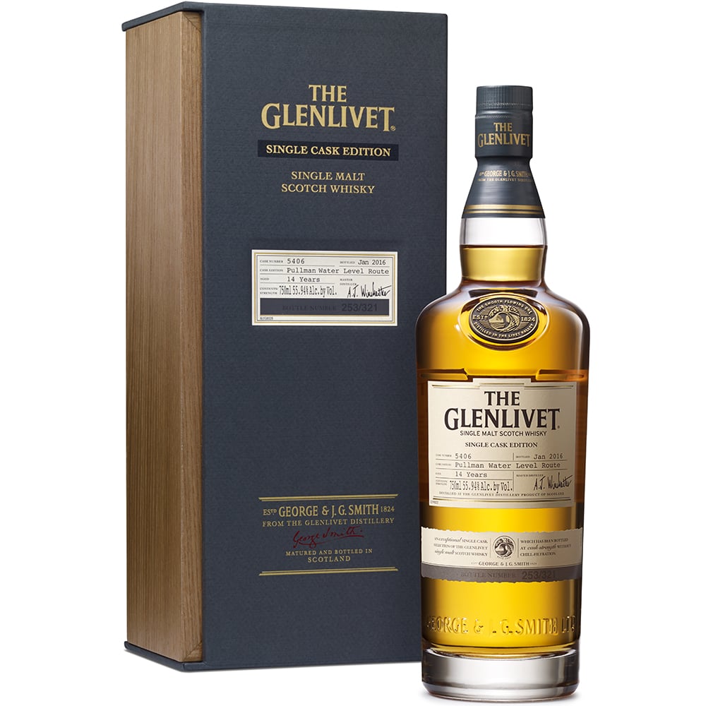 The Glenlivet Pullman collection pays homage to the history and sophisticated style of Pullman trains, which were the epitome of luxury travel in early 20th century America. In the 1930s, after the end of Prohibition, the last distilling descendant of The Glenlivets founder George Smith, Captain Bill Smith Grant, travelled to New York to secure The Glenlivet as the exclusive scotch whisky served in the Pullman dining cars thus spreading his whiskys fame throughout the U.S.The Glenlivet is universally recognized for its single malt scotch whisky – to receive the title of single malt, a whisky must be produced in a single season by a single distillery. One step beyond single malt, The Pullman Collection represents the first time that The Glenlivet has made scotch from a single cask available the U.S. The Glenlivet Pullman Water Level Route Single Cask, Single Malt Scotch Whisky was aged in a single American Oak Hogshead cask filled in 2001. Initial floral notes on the nose are balanced by sweet chocolate and peaches. The palate starts with honey and vanilla followed by sweet melon and barley. The finish is soft and balanced.Only 321 of these limited edition bottles are available throughout the U.S. Pick up yours today!